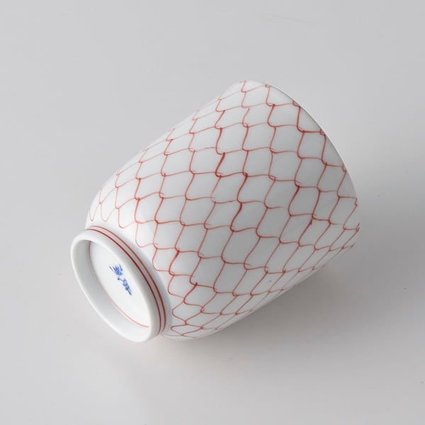 幾何学的な吉祥文様です。網目で幸が救える。更に中風のまじないとして茶碗やお椀を使っている愛好者もいるそうです。薄手のお湯のみで上品な器です。