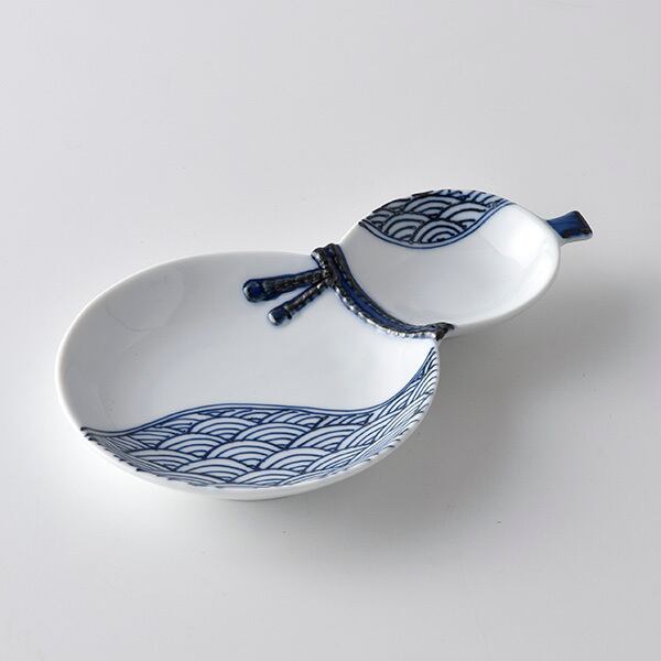 縁起のいいひょうたんを形にした器です。小さいくぼみにはお醤油大きいくぼみにはお刺身入れなどにもご利用できます。